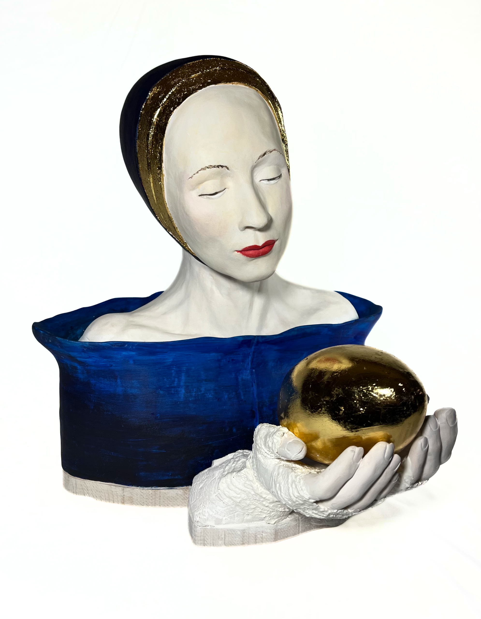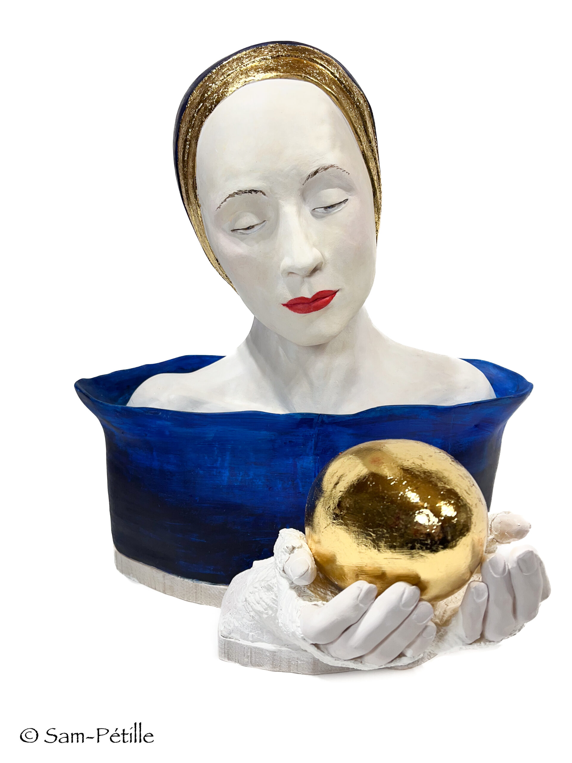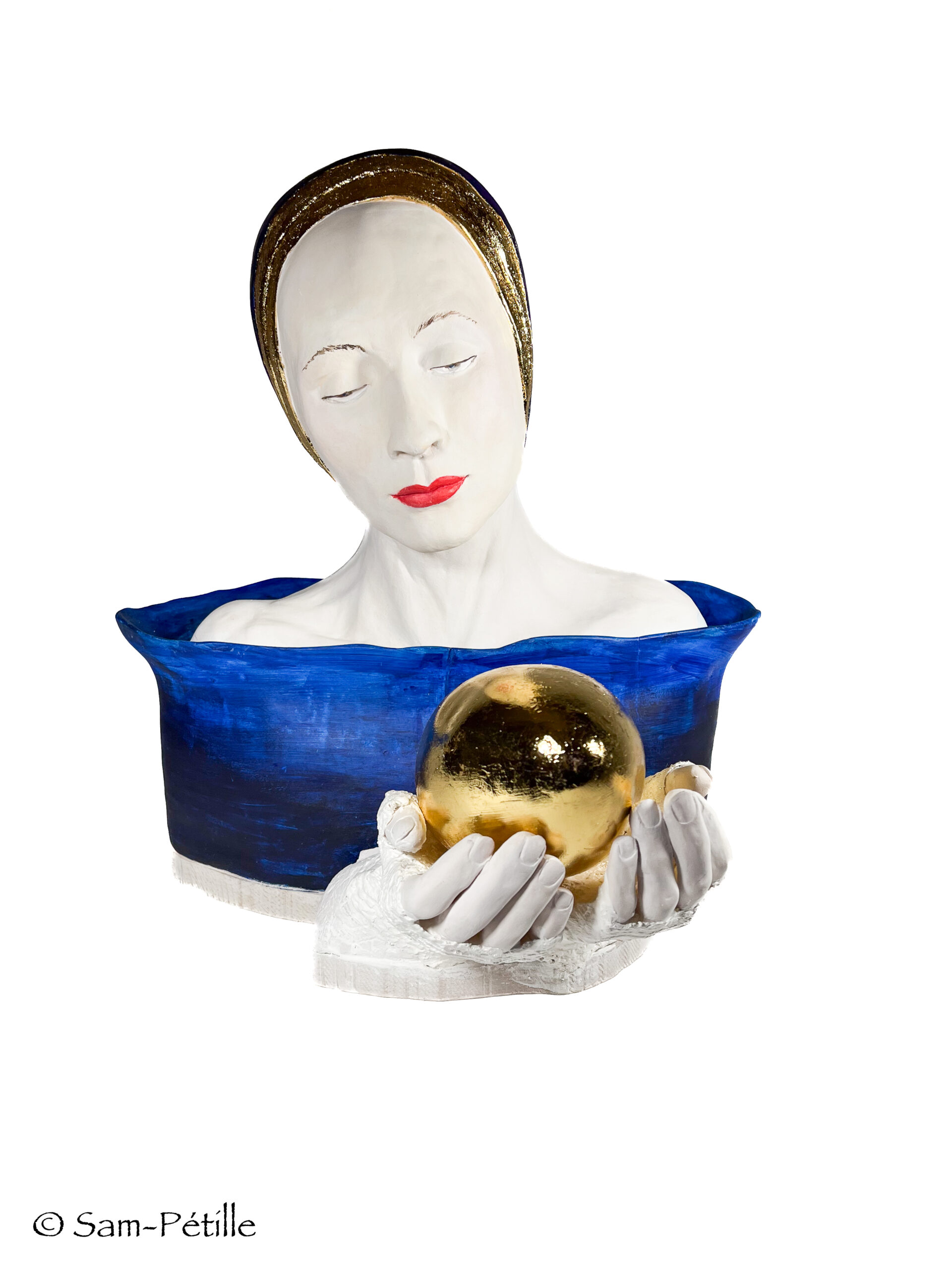 Terre cuite. Peinture acrylique aérographe. Cire et pigments. Feuille dorée. Vernis